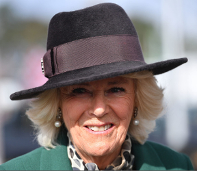 Duchess of Cornwall’s textured black beret with mottled green feather by Philip Treacy worn May 8
