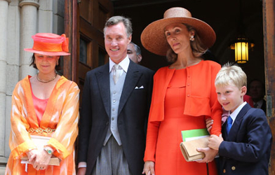 Princess Alexandra of Luxembourg tucked a fresh floral spray into her chignon. Her aunt, Archduchess Marie-Astrid, wore an navy rolled sinamay leaf fascinator with dotted veil while Countess Marie-Christine de Limburg-Stirum wore a sculpted dusky pink headpiece.