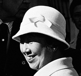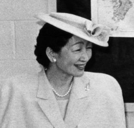 The next day the Empress wore a stylized boater in white and navy blue to another luncheon at the Department of State. That same day they were seen at Arlington Cemetery; Michiko wore another boater, this time in black and white with a small floral trim.