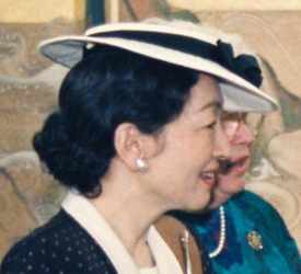12 years later almost to the day after the visit of his parents, then-Crown Prince Akihito and Crown Princess Michiko visited DC. For their arrival at Joint Base Andrews on October 5, 1987, Crown Princess Michiko wore a black pillbox with flower. She changed for the America-Japan Society luncheon later that day to a percher cocktail hat with a stylized bow trim, presumably in the same color and fabric as her skirt suit.