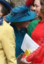 Lady Gabriella’s aunt, Princess Alexandra wore a new hat in beautiful teal felt, trimmed with a wide hatband and purple and teal burnt feathers anchored at the front with a jeweled multi-loop bow. The Countess of St. Andrews (daughter-in-law of the Duke and Duchess of Kent) topped her pink suit with a wide brimmed straw hat in pale blue-grey with pleated crin in the same colour folded around the hat’s brim. The design is completed with pink sinamay ribbon loosely wound around the hat that finishes in a looping bow at the front, studded with two pink quills. I wish better views of Sylvanna’s hat were visible because it looks like a beaty.