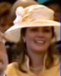 Mette-Marit Tjenssem, who would become Crown Princess of Norway three months later, wore a blush coat with sequin detail repeated on the hatband of her cream picture hat. It was another quiet ensemble (despite the sequins) but nice, from today’s vantage point, to see Mette-Marit in a brimmed design.